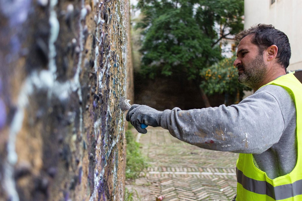 El Ayuntamiento de Sevilla ha comenzado esta semana la eliminación de las pinturas vandálicas que afeaban la muralla que rodea los Jardines del Valle, tanto en el lienzo interior de este parque, como en el exterior que presenta fachada a la calle Sol. La Gerencia de Urbanismo ha destinado 13.424 euros a estas tareas de conservación, que estarán terminadas en unas dos semanas.