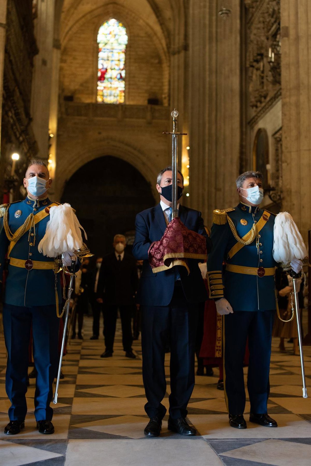 El alcalde de Sevilla, Juan Espada porta la espada de San Fernando en el interior de la Catedral en los actos religiosos con motivo de la Festividad de San Clemente. En la Catedral de Sevilla a 23 de noviembre 2020 - Eduardo Briones - Europa Press