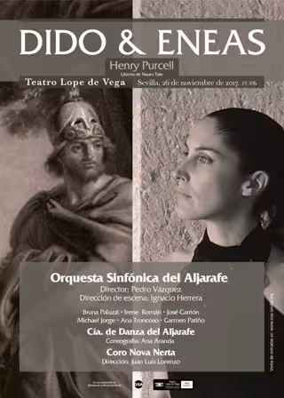 Teatro Lope de Vega de Sevilla acoge este domingo 26 de noviembre, a las 19,30 horas, la ópera 'Dido y Eneas', obra musical del compositor británico barroco Henry Purcell (1659-1695) y con libreto del poeta inglés Nahum Tate (1652-1715). Está dirigida por Pedro Vázquez Marín, cuenta con la dirección de escena de Ignacio Herrera y el acompañamiento musical de la Orquesta Sinfónica del Aljarafe.
