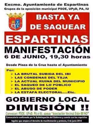 Las fuerzas de oposición del Ayuntamiento de Espartinas (Sevilla) han denunciado ante la Policía Local la retirada de los carteles colgados por dichos partidos políticos convocando a la ciudadanía a celebrar a las 19,30 horas de este viernes una manifestación en el municipio, para pedir la dimisión del alcalde, Domingo Salado (PP). Según la denuncia, recogida por Europa Press, los carteles fueron retirados por un dispositivo del Ayuntamiento y depositados "en la Jefatura de la Policía Local".