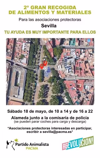 El Partido Animalista Contra el Maltrato Animal (Pacma) celebrará este sábado, 18 de mayo, la segunda edición de la recogida de alimentos y materiales para animales necesitados en Sevilla.