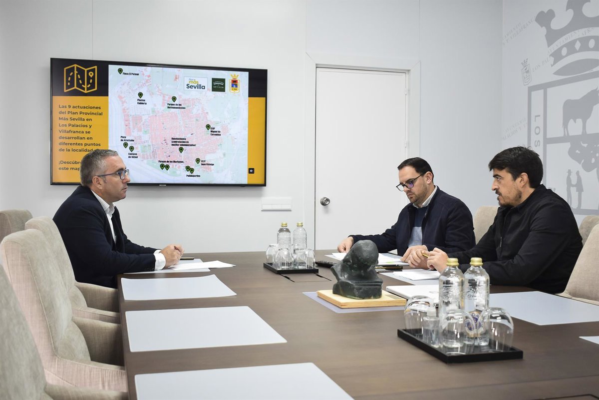 El alcalde de Los Palacios y Villafranca (Sevilla), Juan Manuel Valle, junto al delegado Municipal de Urbanismo, José Manuel Triguero, ha avanzado las iniciativas que se ejecutarán en el municipio con cargo al Plan Provincial 'Más Sevilla' de Diputación por un valor de 1.696.722 euros. Se trata de nueve proyectos que el Ayuntamiento va a desarrollar en dos líneas estratégicas: varias actuaciones de eficiencia energética e hídrica (509.016 euros), y otras tantas destinadas a la adecuación de instalaciones deportivas y en parques y jardines (1.156.078 euros).