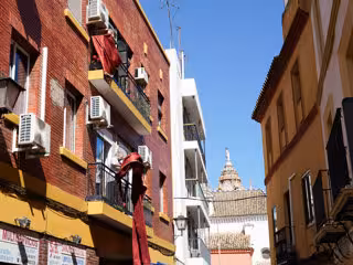Vecinos de la Calle Santiago del barrio del centro de Sevilla adornan su balcón con colgaduras en vísperas de Semana Santa. - Eduardo Briones - Europa Press