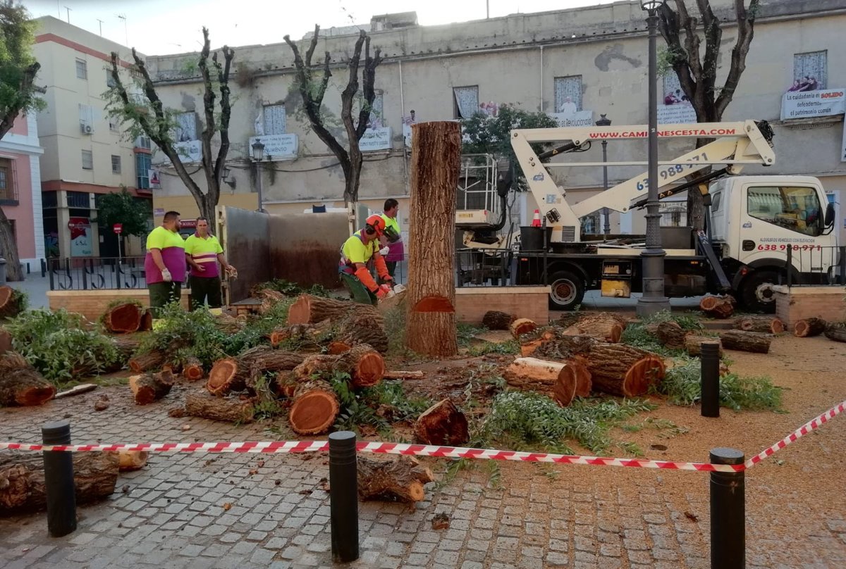 El concejal de Participa Sevilla Julián Moreno ha denunciado este lunes que la plaza del Pumarejo, en el sector norte del casco histórico, está siendo despojada de sombra como consecuencia de una tala de árboles acometida por el Ayuntamiento hispalense en este espacio.