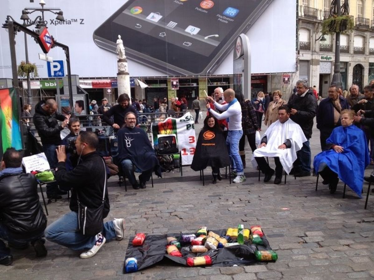 Decenas de personas han recibido este domingo un 'corte de pelo solidario' a cambio de dos kilos de alimentos en una improvisada peluquería al aire libre que han montado en la Puerta del Sol de la capital madrileña profesionales de la Asociación de Artesanos Peluqueros de Sevilla, iniciativa a la que también se han sumado miembros de la Asociación de Empresarios Peluqueros de Madrid.