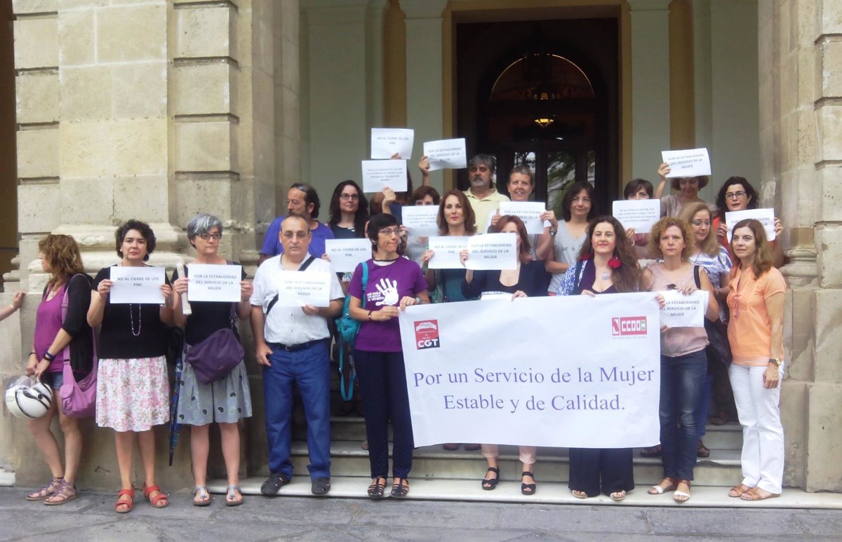 Un grupo de trabajadoras de los Puntos de Información a la Mujer (PIM) en Sevilla se han concentrado a las puertas del Ayuntamiento hispalense para reclamar "estabilidad" en este servicio, pidiendo la declaración de "esencial" del servicio.
