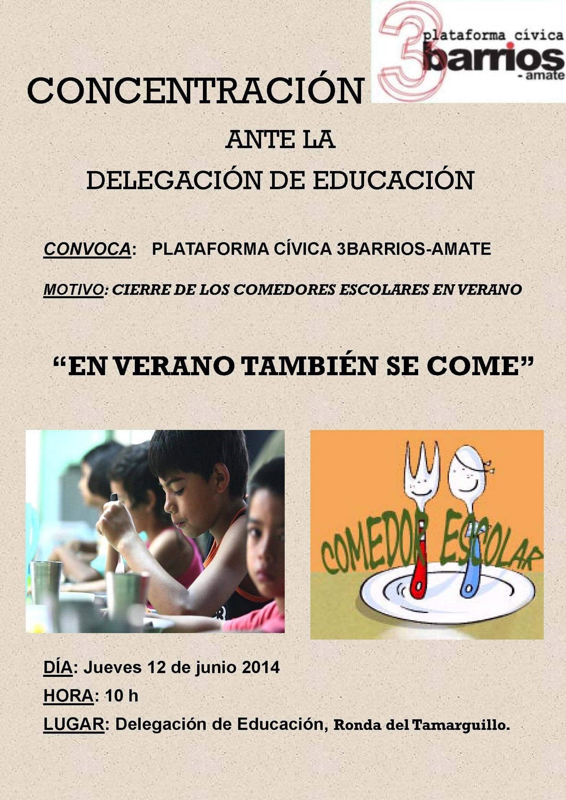 La Plataforma Cívica Tres Barrios-Amate ha convocado para el día 12 de junio una concentración ante la Delegación Territorial de Educación, Cultura y Deporte en Sevilla, ubicada en la Ronda del Tamarguillo, con el objetivo de pedir a la Junta de Andalucía que abra los comedores escolares en los meses de vacaciones, bajo el lema 'En verano también se come'.
