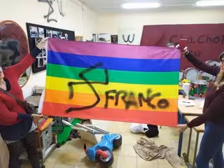 Interior destrozado de la sede Yemú Yambá, donde sus usuarias muestran una bandera arcoíris pintada - ADELANTE ANDALUCÍA