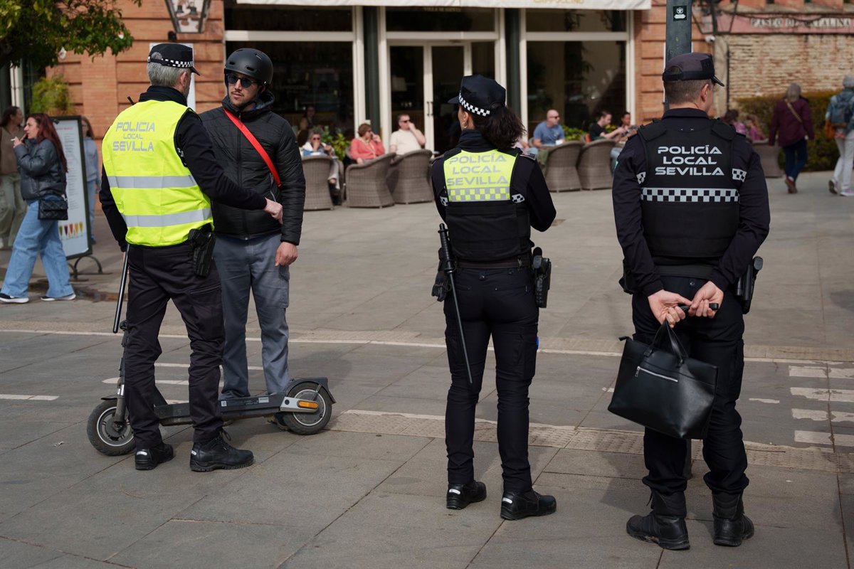 Agentes de la Policía Local de Sevilla informa a un usuarios de patinete eléctrico de la entrada en vigor de la normativa que regula su uso. - Francisco J. Olmo - Europa Press