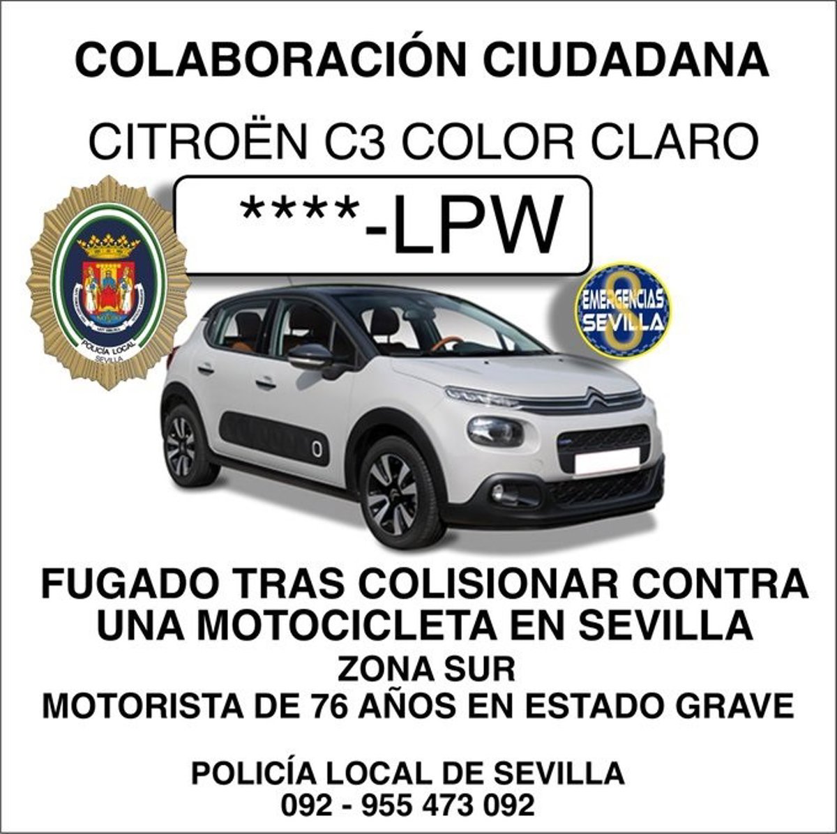 La Policía Local de Sevilla pide colaboración ciudadana para localizar al conductor de vehículo Citron Cs de color claro o dorado acusado de darse a la fuga tras colisionar contra una motocicleta en la zona sur de la ciudad dejando herido grave a un hombre de 76 años.