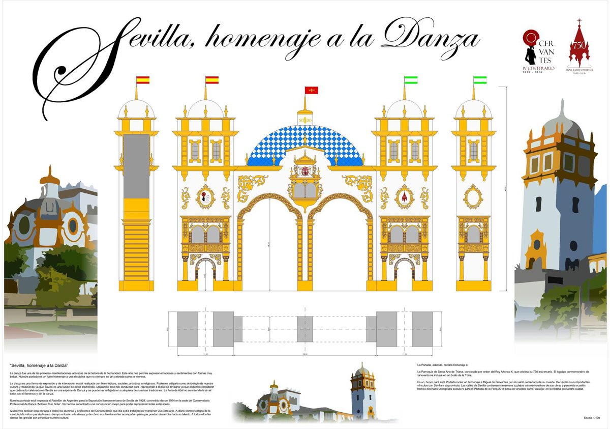El Ayuntamiento de Sevilla ha presentado este jueves el diseño base ganador del concurso de ideas para la portada de la Feria de Abril de 2016, que estará inspirada en el Pabellón de Argentina de la Exposición Iberoamericana de 1929. Bajo el lema 'Sevilla, homenaje a la danza', el diseño, obra de Eduardo Morón, recrea este edificio que se encuentra situado en el Paseo de las Delicias.