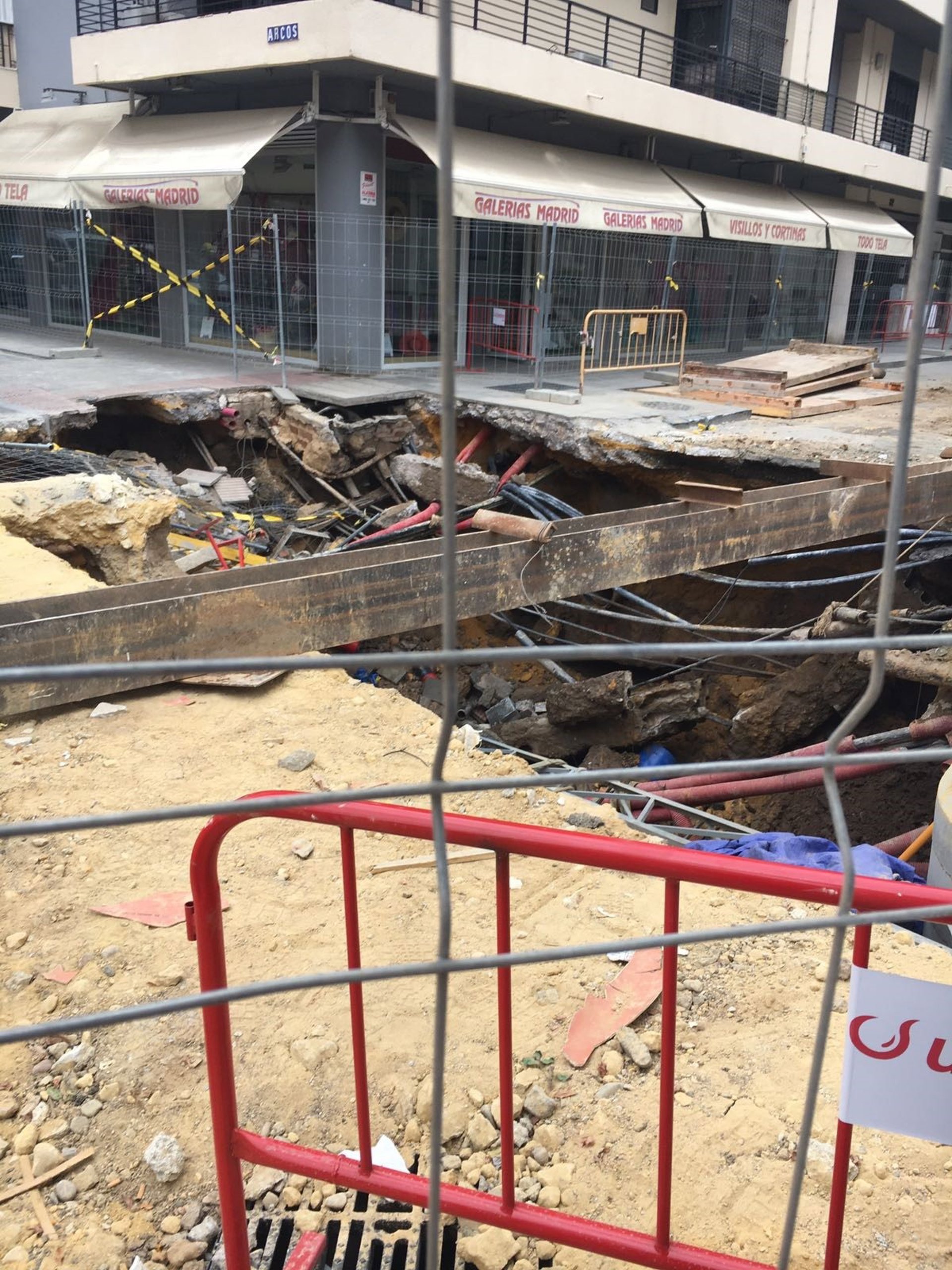 Según explica el PP en un comunicado, "el hundimiento del suelo se ha producido en las intersección de la calle Nieblas con Arcos, a escasos centímetros de varios comercios que esta mañana mostraban su temor por el desarrollo de unas obras que, como denunció el PP hace unos meses, no se están realizando con la diligencia debida".