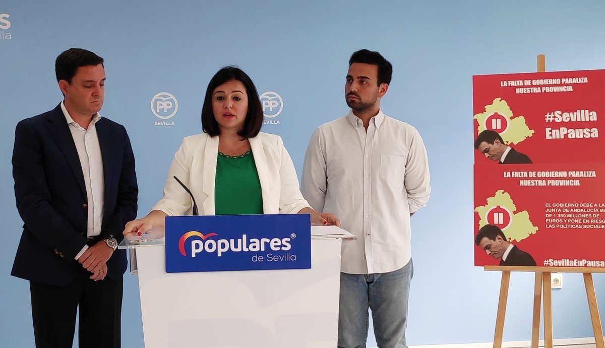 La presidenta del PP de Sevilla, Virginia Pérez; el secretario general del PP de Sevilla, Juan de la Rosa; y el presidente de NNGG de Sevilla, Pedro González, han presentado este martes la campaña 'Sevilla en Pausa', que denuncia las consecuencias de la "parálisis absoluta" que sufren España y Sevilla por las políticas del Ejecutivo socialista de Pedro Sánchez y la falta de un gobierno conformado con plenos poderes.