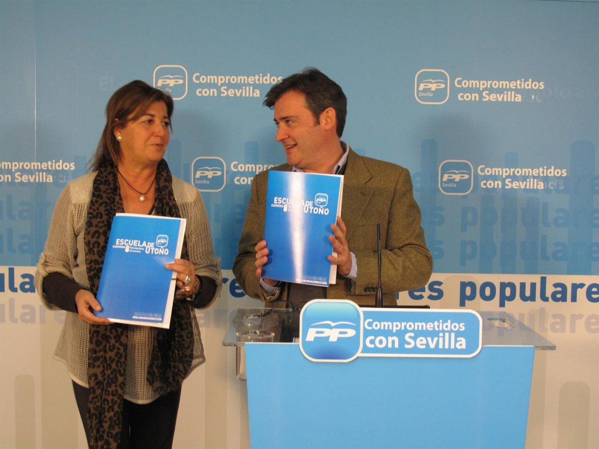 El secretario general del PP de Sevilla, Eloy Carmona, y la vicesecretaria de Ideas, Programas y Formación, María José Rodríguez Gavira, han presentado este jueves la programación de la Escuela de otoño del partido, que tendrá lugar este fin de semana en Carmona para formar a sus concejales de cara a las próximas elecciones municipales de 2015.