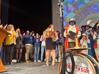 Y uno de los platos "fuertes" llegó con la entrega de la Máscara de Oro al "conocido" carnavalero dentro y fuera de Alcalá, Jesús Gómez León, ha explicado el Ayuntamiento. Junto a su familia y rodeado de todas las anteriores Máscaras de Oro de Alcalá, el público "llenaba de aplausos las palabras de un carnavalero que no podía contener las lágrimas".