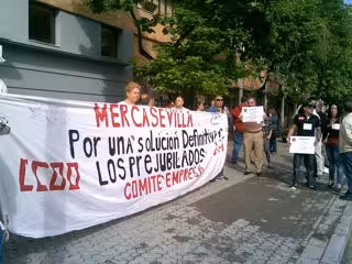 Los ex trabajadores de la sociedad mixta Mercasevilla prejubilados merced al expediente de regulación de empleo (ERE) de 2007, acampados a las puertas de esta empresa participada por el Ayuntamiento hispalense y Mercasa, protagonizaron hoy una caravana de coches cuyo recorrido ha comprendido las sedes de las instituciones a las que se reclama que la Junta colabore en la financiación de sus prestaciones, pues la compañía afronta un pasivo de más de nueve millones de euros por este concepto al desligarse el Gobierno andaluz del pago de las nóminas.