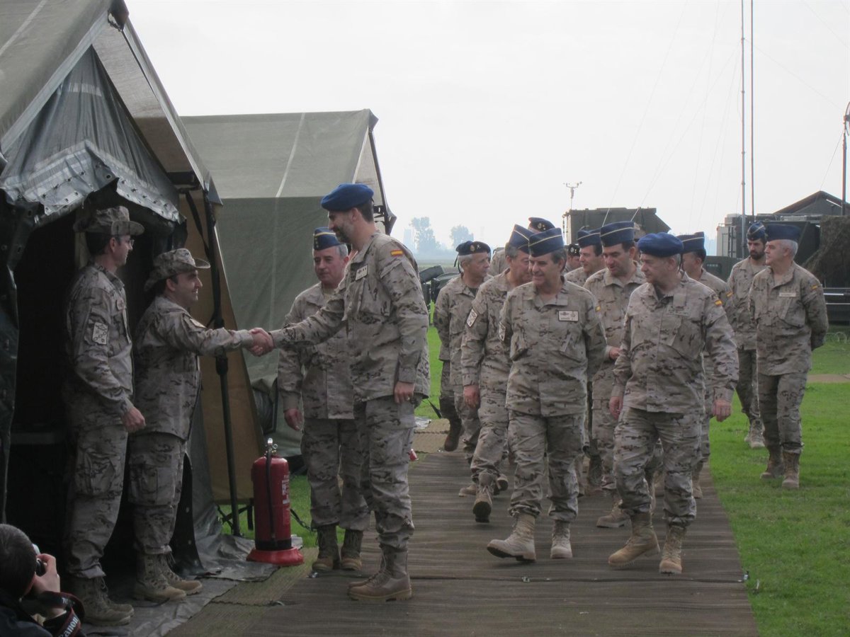 Ataviado con el uniforme de campaña mimetizado árido y una boina azul y con la insignia de teniente coronel, el Príncipe Don Felipe ha realizado un recorrido por la exposición estática desplegada con los medios del Grumoca, unidad que cuenta con una plantilla aproximada de 173 personas, de las que el diez por ciento son mujeres, y ha sido informado de las novedades incorporadas al Grumoca, entre ellas el módulo de mando y control.