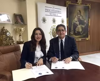 La decana del Colegio de Procuradores de Sevilla, Isabel Escartín, y el decano del Colegio de Abogados, José Joaquín Gallardo, han firmado en la sede de los procuradores sevillanos un convenio de colaboración con la finalidad de facilitar una mejor y más eficaz prestación de los servicios de asistencia jurídica gratuita a los ciudadanos y a los servicios de orientación jurídica de ambos colegios, así como a los órganos judiciales y profesionales.