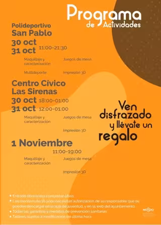 Las actividades están recomendadas para mayores de 14 años. No obstante, los menores de 16 años que deseen participar en el programa deberán aportar la autorización del padre, madre o tutor o tutora legal. Se ofertan propuestas como maquillaje y caracterización, multideporte, juegos de mesa o impresión 3D. Además, en todos los centros los jóvenes encontrarán escape room, realidad virtual y juegos de PS5, actividades de cultura japonesa, paperkraft y K-Pop, juegos de mesa, cosplay y zonas de videojuegos y torneos de LOL, FIFA y Fornite. Además, se repartirán regalos entre las personas que vayan disfrazadas.
