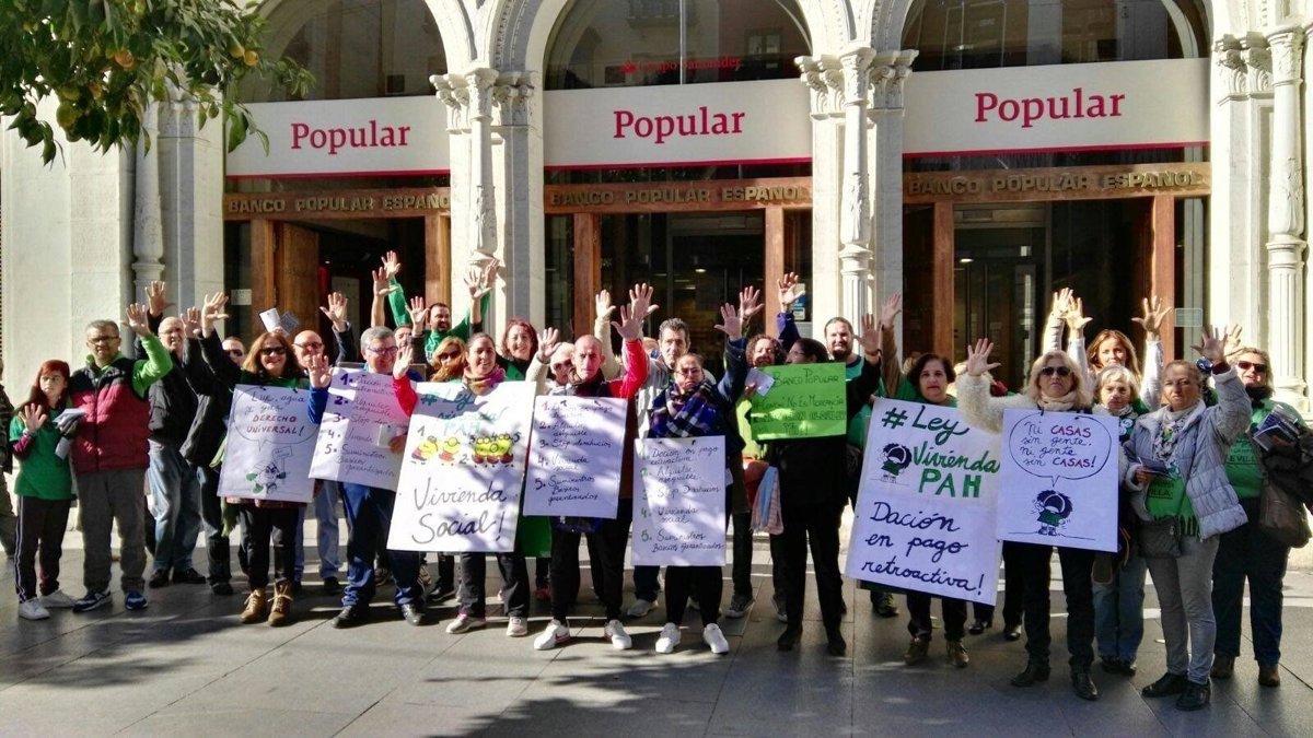 La Plataforma de Afectados por la Hipoteca (PAH) ha celebrado este martes una concentración a las puertas de una céntrica sucursal del Banco Popular, en demanda de que la entidad financiera acceda a renovar el alquiler social pactado hace algo menos de tres años con una mujer, para habitar el piso de la avenida Alcalde Manuel del Valle que había entregado precisamente como "dación en pago" al no poder sufragar las cuotas de una hipoteca.