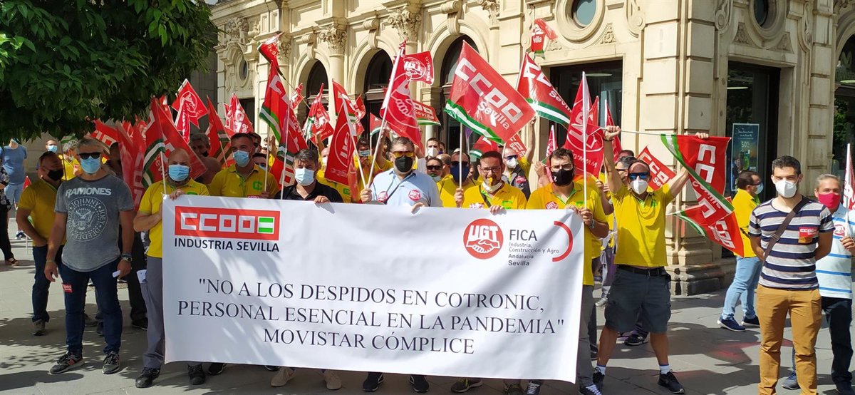 CCOO y UGT de Sevilla han rechazado este lunes los "despidos injustificados" y las sanciones disciplinarias en la empresa Cotronic, subcontrata de Movistar que realiza el despliegue de redes de telecomunicaciones, instalación y mantenimiento de líneas y equipos, con una concentración frente a la tienda de la compañía telefónica en la Plaza Nueva de la capital andaluza.