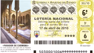 La fotografía del boleto de lotería es del patio y la fuente mudéjar del Parador de Carmona, además, en los décimos se realiza una breve reseña sobre el inmueble histórico, del que se destaca su ubicación en un alcázar del siglo XIV. "El parador es un verdadero balcón colgado sobre la vega del río Corbones", señalaron desde Paradores en un comunicado.