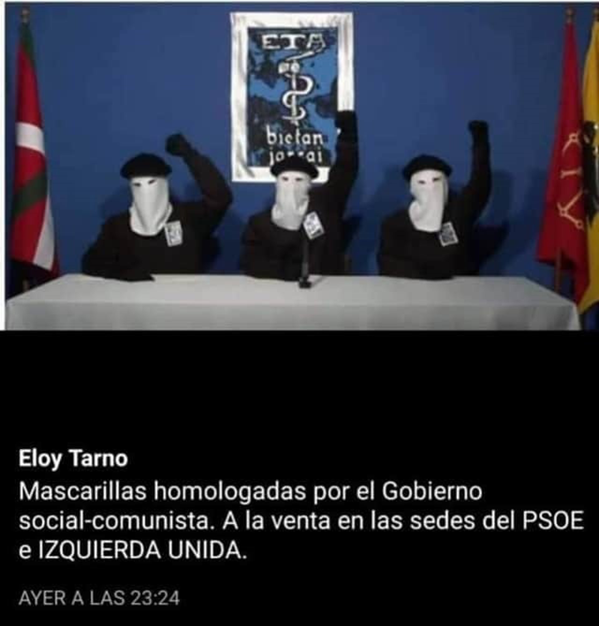 La moción atribuye a Tarno la difusión de "una foto en la que se observa a tres miembros de la banda terrorista ETA ataviados con pasamontañas", a cuyo pie indicó textualmente "Mascarillas homologadas por el gobierno social-comunista. A la venta en las sedes del PSOE e IU"; así como una publicación donde el concejal popular alude a una vídeo grabado por miembros de IU Lora del Río, sobre el que comenta lo siguiente: "Ni tienen vergüenza ni la han conocido".