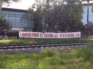Imagen de la pancarta colocada en el puerto de Sevilla para solicitar que no lleguen más toneladas de residuos al vertedero de Nerva y para pedir su cierre. - IU.