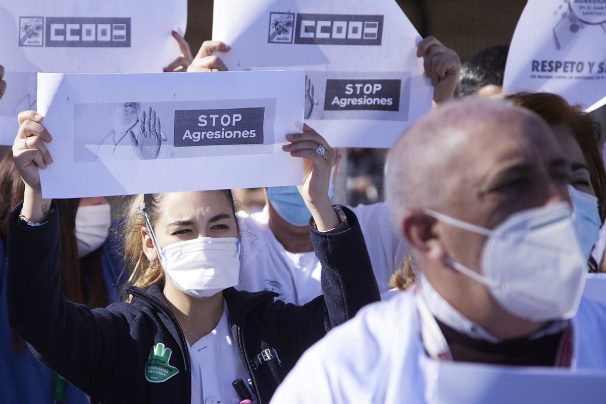 Varios manifestantes durante la concentración por la grave agresión sufrida por trabajadores de Urgencias - Joaquin Corchero - Europa Press