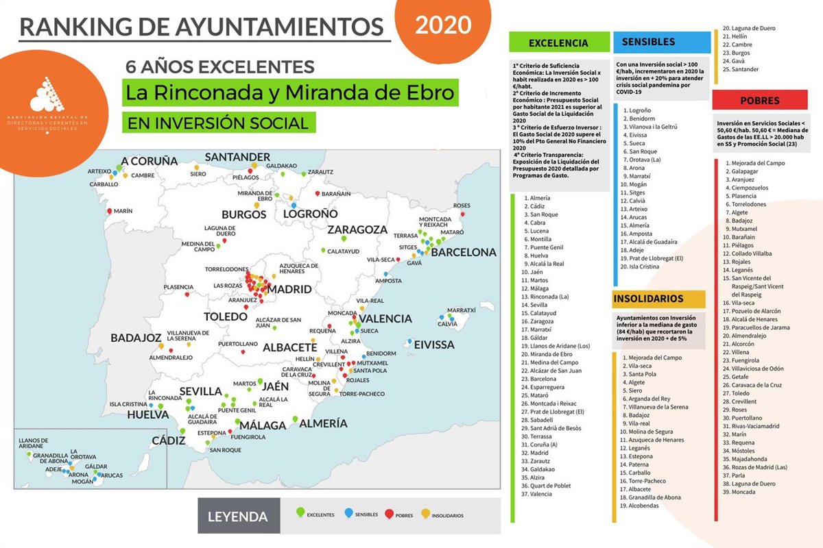 Un total de 37 ayuntamientos de España alcanzaron el nivel de excelencia en 2020, de los que solo el municipio burgalés de Miranda de Ebro comparte con el de La Rinconada (Sevilla) este reconocimiento en sus presupuestos desde 2015, entre todas las localidades de España mayores de 20.000 habitantes, por lo que han revalidado este título por sexto año.