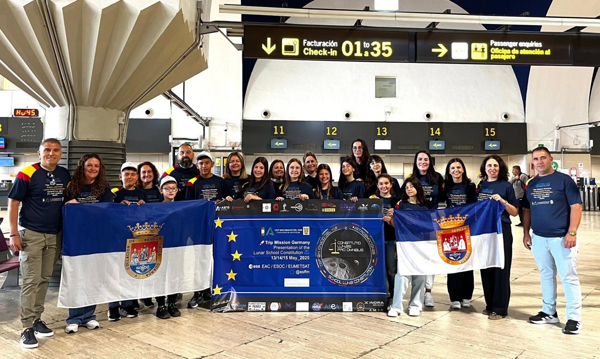 Este lunes ha partido ya desde el aeropuerto de Sevilla la expedición del colegio público San Ignacio del Viar de dicha población de Alcalá del Río, que visitará estos días el Centro de Operaciones de la Agencia Espacial Europea, ubicado en Darmstadt, en las inmediaciones de Fráncfort (Alemania); previa invitación de dicha institución comunitaria para que un grupo de alumnos/as presente ante la misma el proyecto de Constitución Escolar Lunar que promueve este centro educativo.