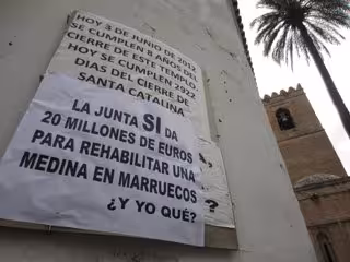 La iglesia de Santa Catalina, un templo neo mudéjar del siglo XIV clausurado al culto hace años debido a graves problemas de conservación, ha amanecido este viernes con un cartel en su fachada cuya leyenda reprocha a la Junta un supuesto libramiento de "20 millones de euros para rehabilitar una medina en Marruecos". "¿Y yo qué?", concluye la citada pancarta, toda vez que hasta el momento el Ayuntamiento hispalense y el Arzobispado de Sevilla han prometido fondos para restaurar el templo, señalando el Consistorio la necesidad de que la Administración andaluza tome parte en el proyecto.