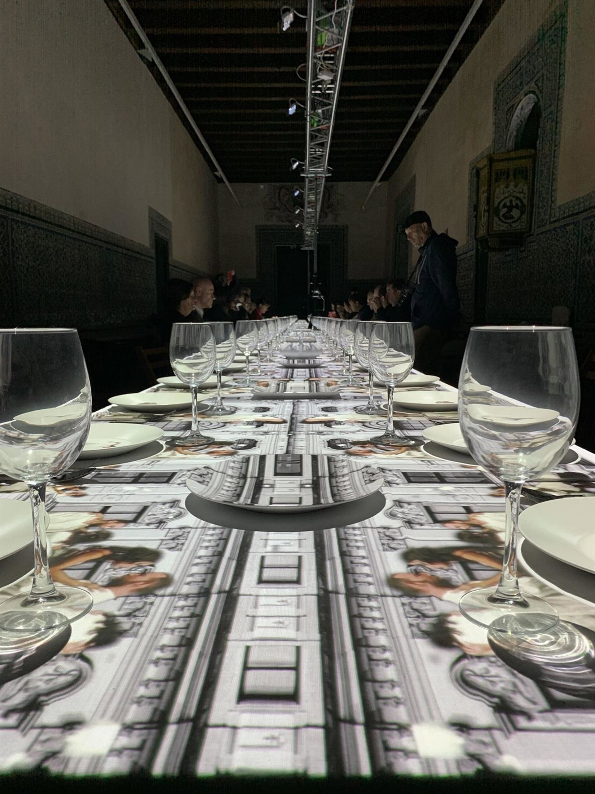 En una mesa dispuesta con todos los elementos propios de una cena de Navidad, se recrea una comida muy especial con "espíritus traviesos" que introducen a los asistentes en un mundo onírico con la iconografía propia de esta época del año, que se mezcla con otras imágenes y elementos que aportan una visión distinta, siempre mágica y poética, de una mesa cuyos platos, vasos y cubiertos "respiran, hablan y muestran viandas virtuales e ilusiones gastronómicas dirigidas a los sentidos".
