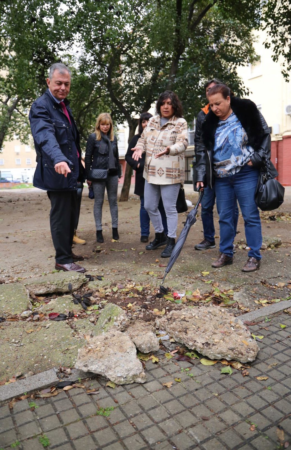 El candidato del PP a la Alcaldía de Sevilla, José Luis Sanz, muestra los problemas en el pavimento en el barrio del Juncal - CANDIDATURA PP