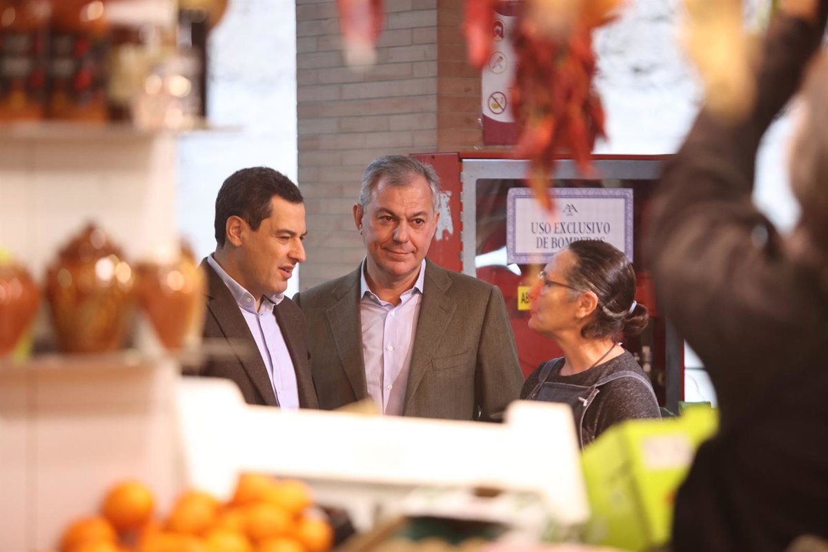 Archivo - El presidente de la Junta de Andalucía, Juanma Moreno, (i) y el candidato a la alcaldía de Sevilla, José Luis Sanz, (2i), en el mercado de Triana. - Joaquin Corchero - Europa Press - Archivo