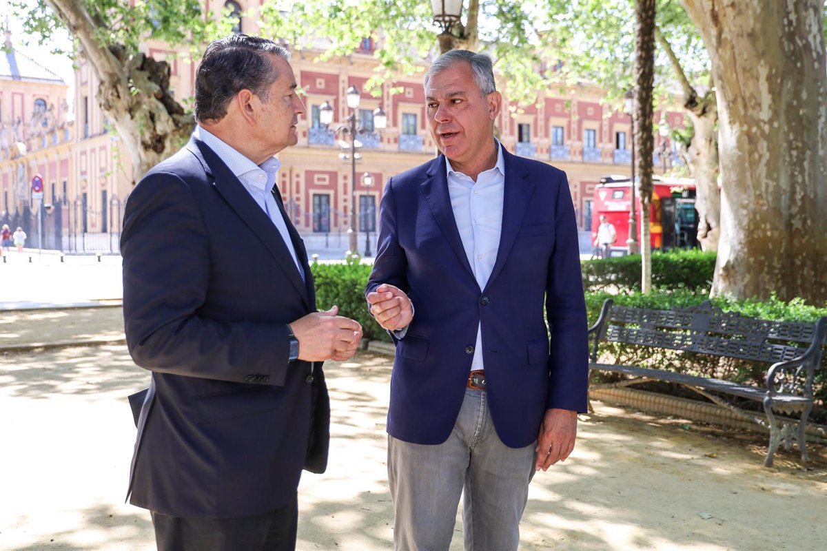 El vicesecretario de Coordinación Institucional del PP de Andalucía, Antonio Sanz, junto al candidato del PP a la Alcaldía de Sevilla, José Luis Sanz, ha recordado este jueves las inversiones del Gobierno de la Junta de Andalucía en Sevilla capital. Así, Antonio Sanz ha destacado que, desde 2019 a 2023, se han invertido un total de 545,35 millones de euros y ya hay "comprometidos" 1.502 millones de euros, contando con el Metro, la Ciudad de la Justicia, obras en centros educativos y diferentes actuaciones en centros sanitarios y hospitales.