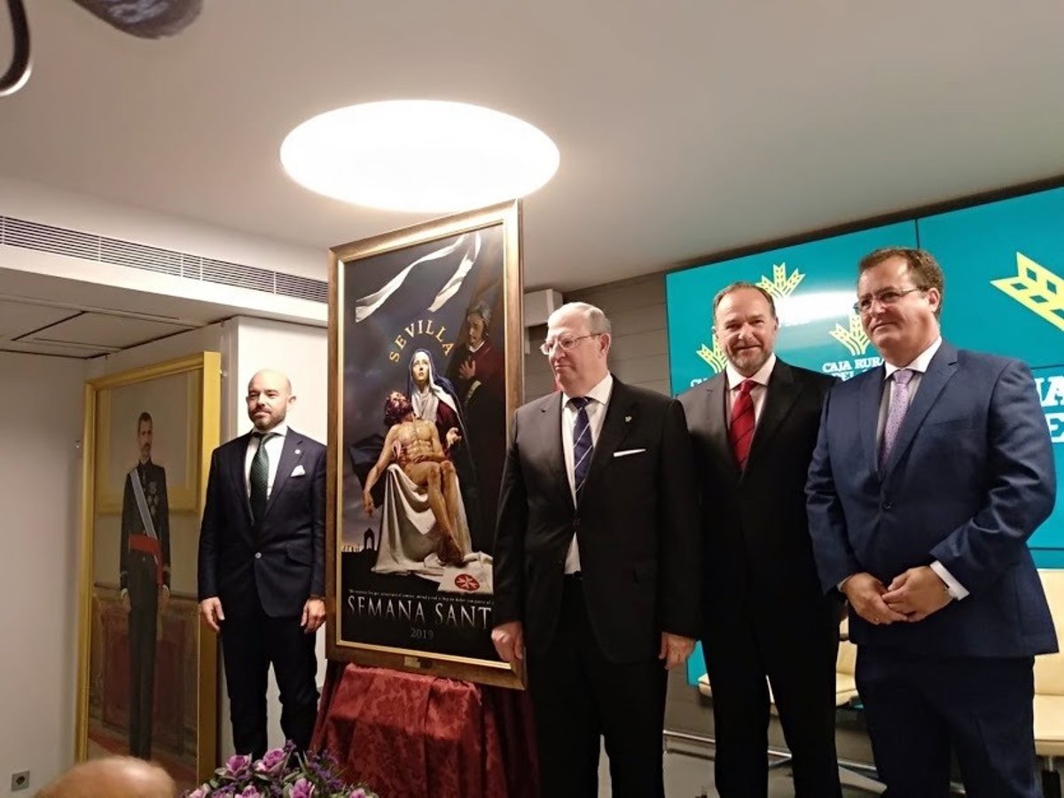 La sede de Caja Rural del Sur en Sevilla ha acogido este sábado el acto de presentación del cartel de la Semana Santa sevillana de este año 2019, encargado en esta ocasión por el Consejo General de Hermandades y Cofradías de Sevilla al sevillano Fernando Vaquero.