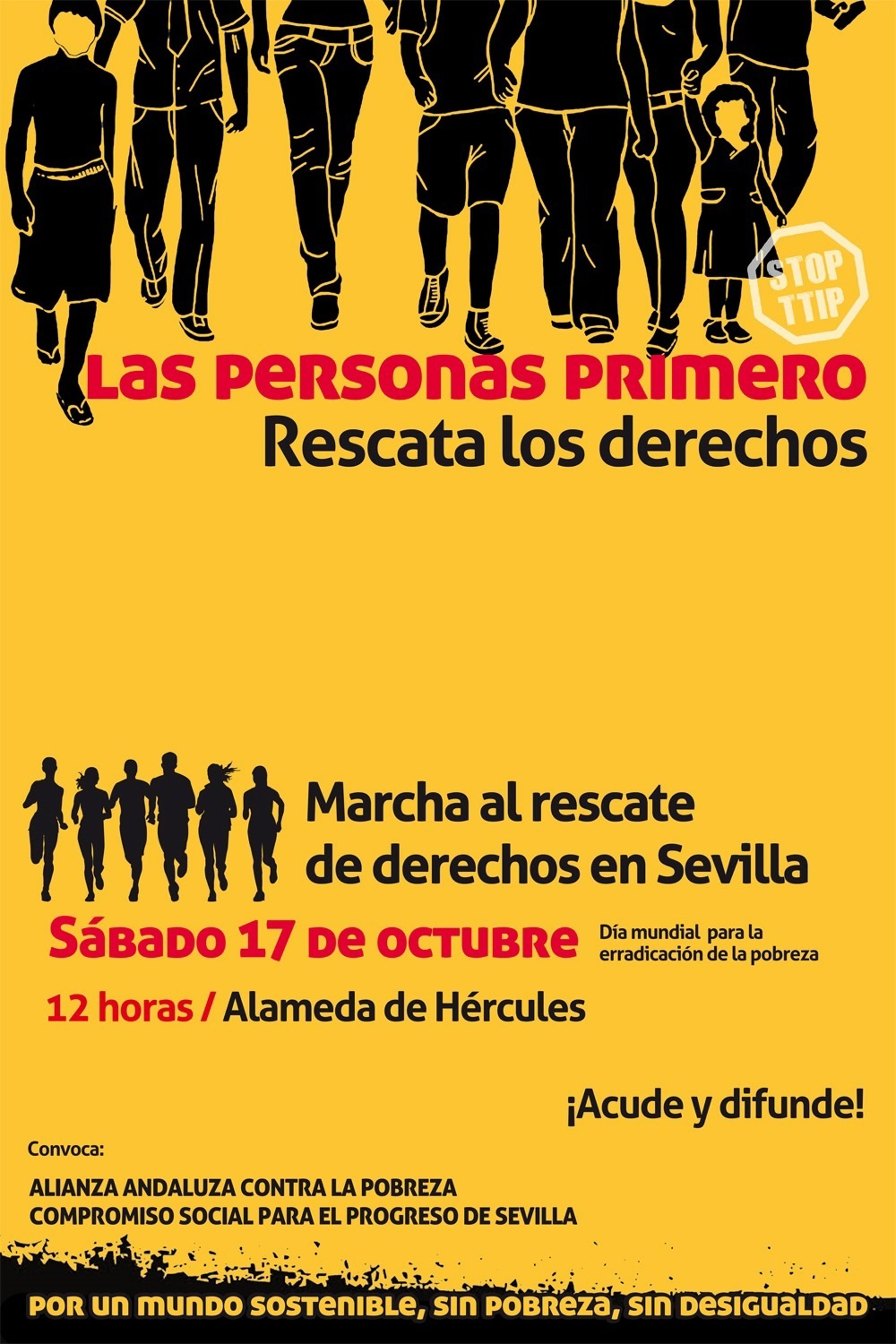 La cita será en la Alameda de Hércules este sábado a las 12,00 horas. Las personas participantes deberán completar una ficha sellando en hitos del recorrido que representan los derechos sociales incluidos en los ODS. También se informará de la campaña STOP TTIP, Acuerdo Transatlántico de Comercio e Inversiones entre la UE y los EEUU, que se desarrolla igualmente en estos días, por su potencial amenaza hacia los derechos sociales.