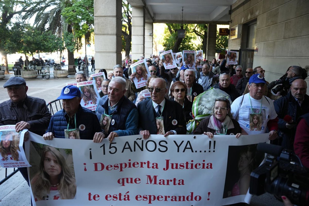 Los aledaños de los Juzgados del Prado de San Sebastián han acogido este miércoles una concentración encabezada por el abuelo de Marta del Castillo, para conmemorar los 15 años de su asesinato, por el cual fue condenado Miguel Carcaño a 21 años y tres meses de cárcel. Durante el acto, en el que han participado más de 200 personas, el abuelo de la víctima y sus amigos y allegados han reclamado una vez más la repetición del juicio celebrado en 2011 contra los adultos acusados en el caso, tres de ellos absueltos; y clonar los móviles de los mismos para avanzar en la búsqueda del cuerpo de la víctima.