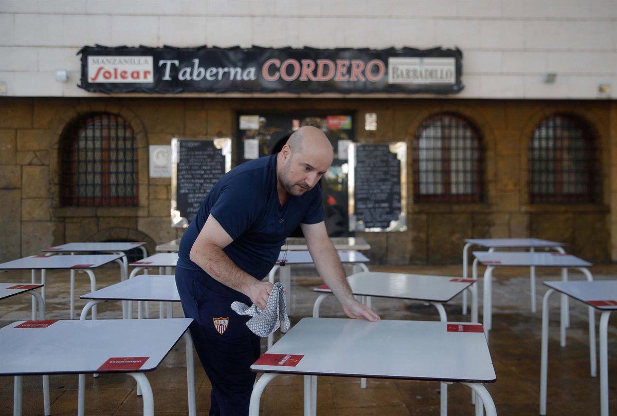 Una persona prepara las mesas para su inminente apertura - MARÍA JOSÉ LÓPEZ-EUROPA PRESS