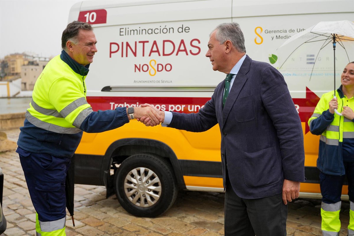 Sanz saluda a un trabajador del servicio de eiminación de grafitis en espacios públicos. - AYTO.DE SEVILLA