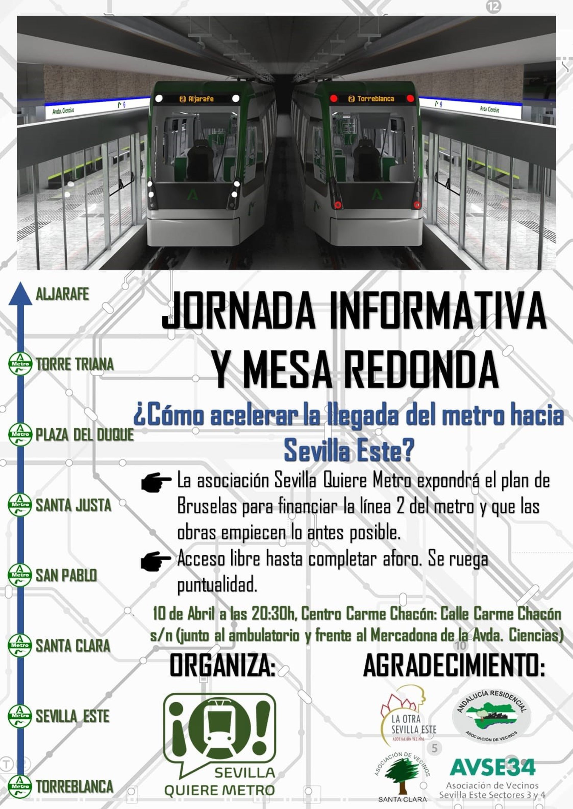 La Asociación Sevilla Quiere Metro, a la que ya respaldan un centenar de entidades, organiza para el próximo 10 de abril, a las 20,30 horas en el Centro Carme Chacón, una jornada para los vecinos de Sevilla Este a fin de explicarles el plan que expusieron a la Comisión Europea para poder "acelerar" la construcción de las líneas 3 --ya en obras en Pino Montano-- y la 2. Ésta última es la que conectará Sevilla Este con la Cartuja pasando por el Centro (plaza del Duque, Cristo de Burgos y Puerta Osario), Santa Justa y San Pablo.