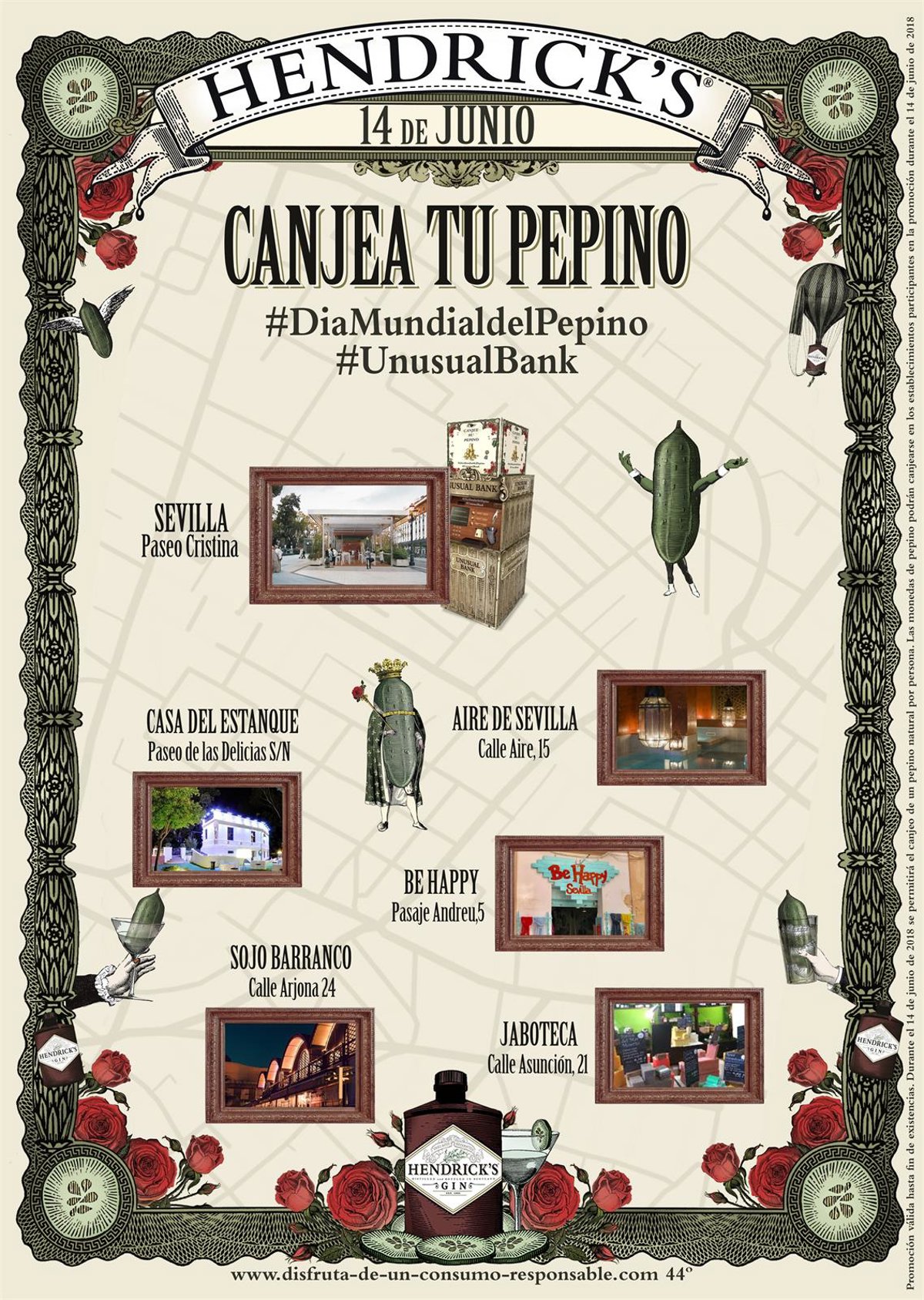 La mecánica es muy sencilla, llevar un pepino auténtico de cualquier especie al Unusal Bank de Hendrick's Gin, de las 9,00 a 15,00 horas, y se podrá canjear por pepino monedas con las que posteriormente comprar en las tiendas y locales impepinables de la ciudad como Aire de Sevilla, Be Happy, Jaboteca, Casa del Estanque y Sojo Barranco.