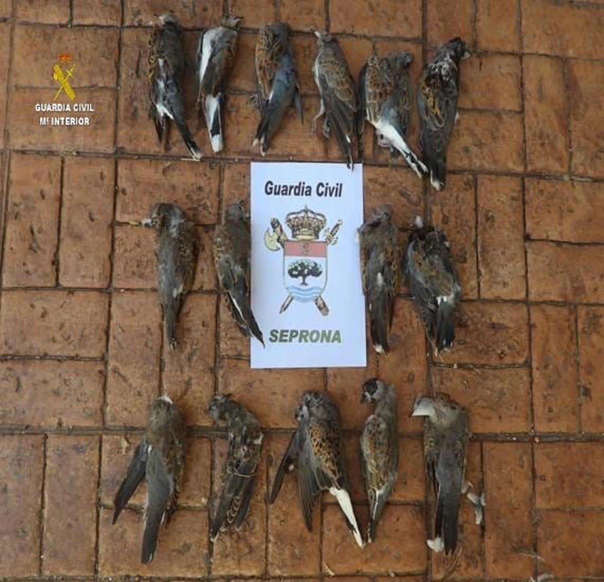 Tres de estos cazadores fueron sorprendidos en el puesto con "numerosas piezas" de tórtola europea (Streptopelia turtur), además de numerosas palomas torcaces. Los cazadores han sido denunciados por cazar desde puesto fijo situado a menos de 250 metros del comedero y bebedero y a menos de 150 metros entre sí, así como tres cazadores por abatir 16 ejemplares de tórtola europea (Streptopelia turtur), así como otras infracciones al vigente Reglamento de Ordenación de la Caza en Andalucía.