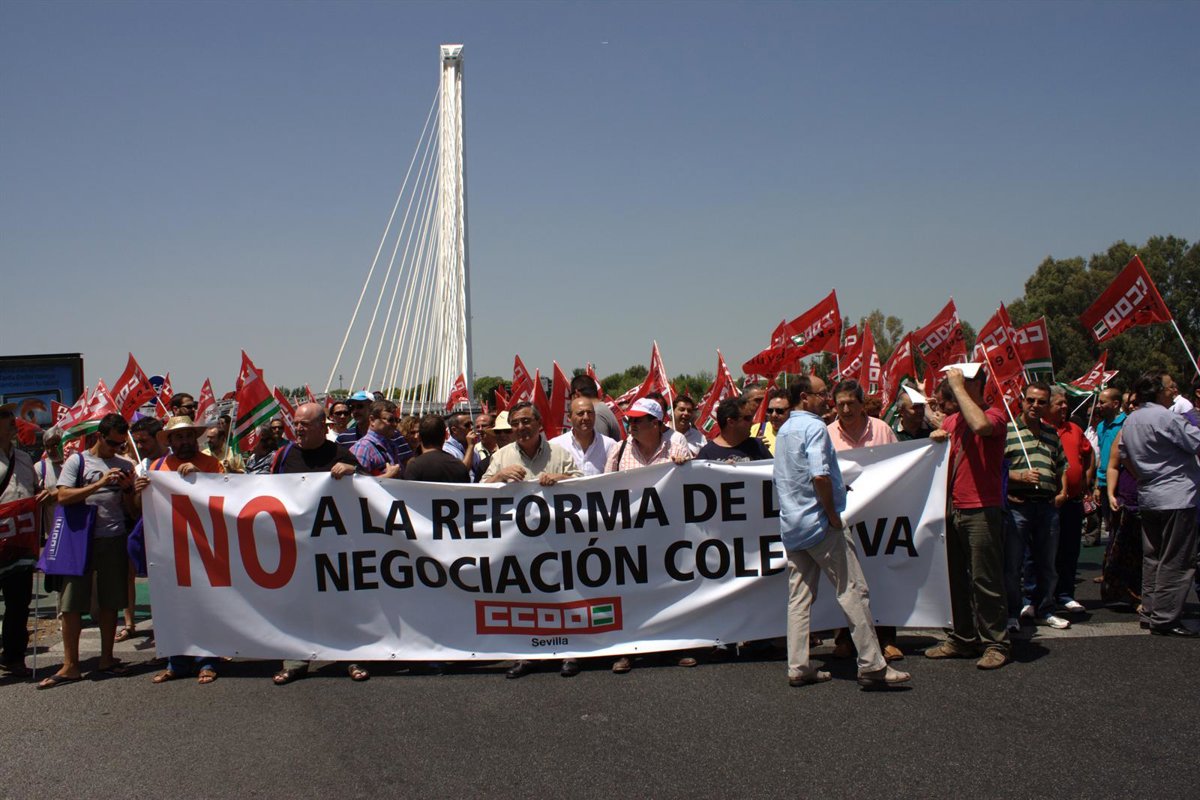 Una gran pancarta con el lema 'No a la reforma de la negociación colectiva" ha encabezado esta movilización liderada por el secretario general de CCOO en Sevilla, Alfonso Vidán. Los sindicalistas, según informa CCOO, arrancaron la protesta en el CREA de San Jerónimo y a las 13,50 horas cerraban al tráfico rodado la glorieta del puente del Alamillo.