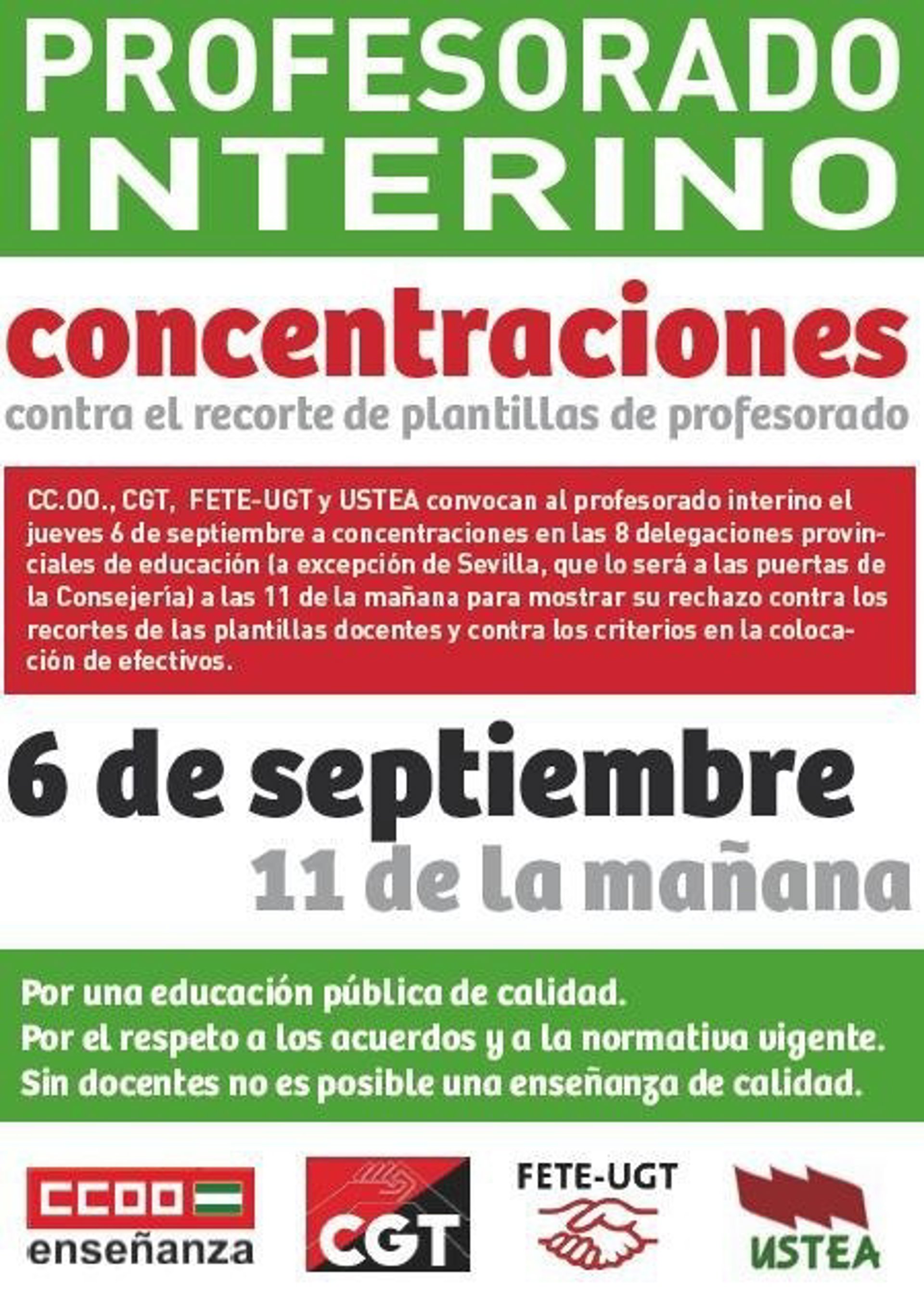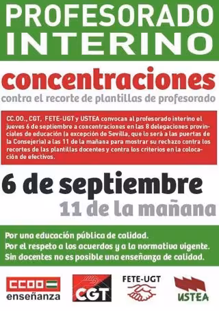 Los sindicatos ANPE, CCOO, CSI-F, CGT, FETE-UGT y Ustea han convocado a los más de 4.500 profesores interinos de Educación Secundaria Obligatoria que este curso no han sido contratados en aplicación del aumento de la jornada lectiva contemplada en el Real Decreto 14/2012 a concentrarse este jueves, a partir de las 11,00 horas, frente a las delegaciones provinciales de Educación de toda la región, excepto en Sevilla, donde se ha convocado a los docentes a las puertas de Torretriana, sede central de la Consejería de Educación.