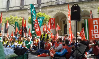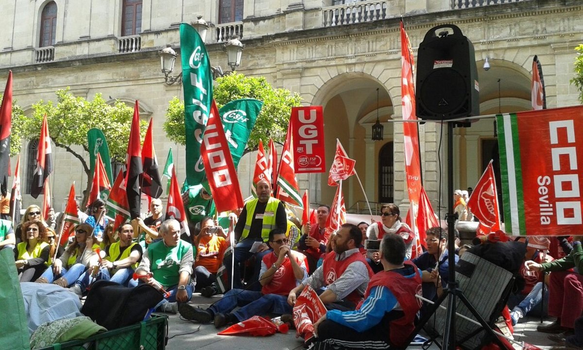 Las secciones de CCOO, UGT, CSIF, el Sindicato de Empleados Municipales (SEM) y el Sindicato Profesional de Policías Municipales de España (Sppme) en el Ayuntamiento de Sevilla han celebrado este viernes una "sentada" en la Plaza Nueva, para reclamar principalmente la cobertura de las más de 800 plazas vacantes en la plantilla municipal, el fin de las externalizaciones y que se fomente el empleo público en los servicios municipales.