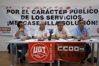 Los secretarios generales de CCOO y UGT en Sevilla, Alfonso Vidán y Juan Antonio Gilabert, respectivamente, junto al comité de empresa del mercado central de abastos hispalense, Mercasevilla, han defendido este viernes que "ningún imperativo legal" o institucional "obliga" a la empresa, cuyo socio mayoritario es el propio Ayuntamiento, a liberalizar los servicios de la lonja, extremo que afecta a cien de los 198 miembros de la plantilla. Mientras la comisión ejecutiva de Mercasevilla ha emprendido ya esta liberalización parcial de servicios, CCOO, UGT y el comité de empresa atribuyen la iniciativa a una mera "decisión política".