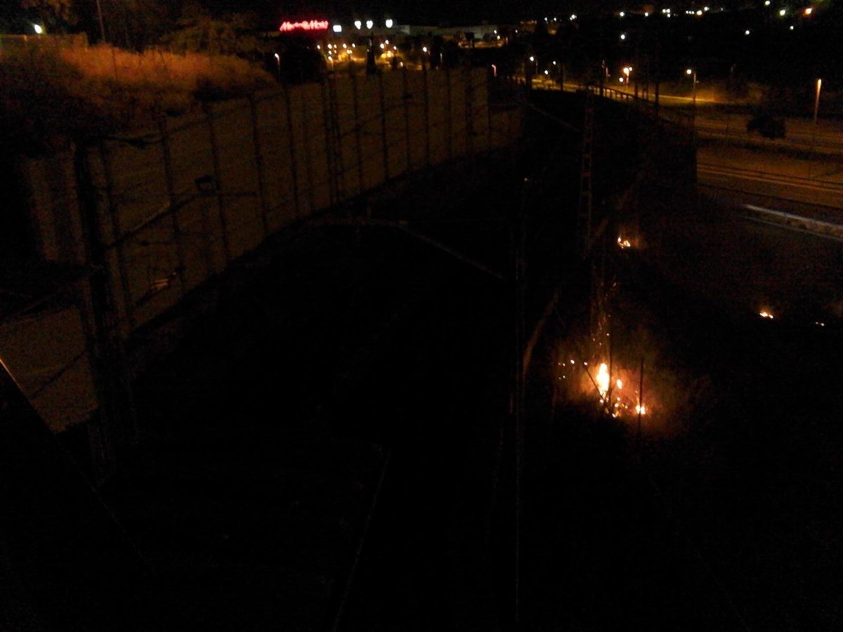 Efectivos del Servicio Provincial de Prevención y Extinción de Incendios (Sepei) de la Diputación de Sevilla han sofocado esta madrugada un incendio declarado en una cornisa enclavada entre el trazado de la autovía A-8057 y la estación de metro de San Juan Alto, en San Juan de Aznalfarache. Las llamas sólo han afectado al matorral y las palmeras que pueblan este desnivel.