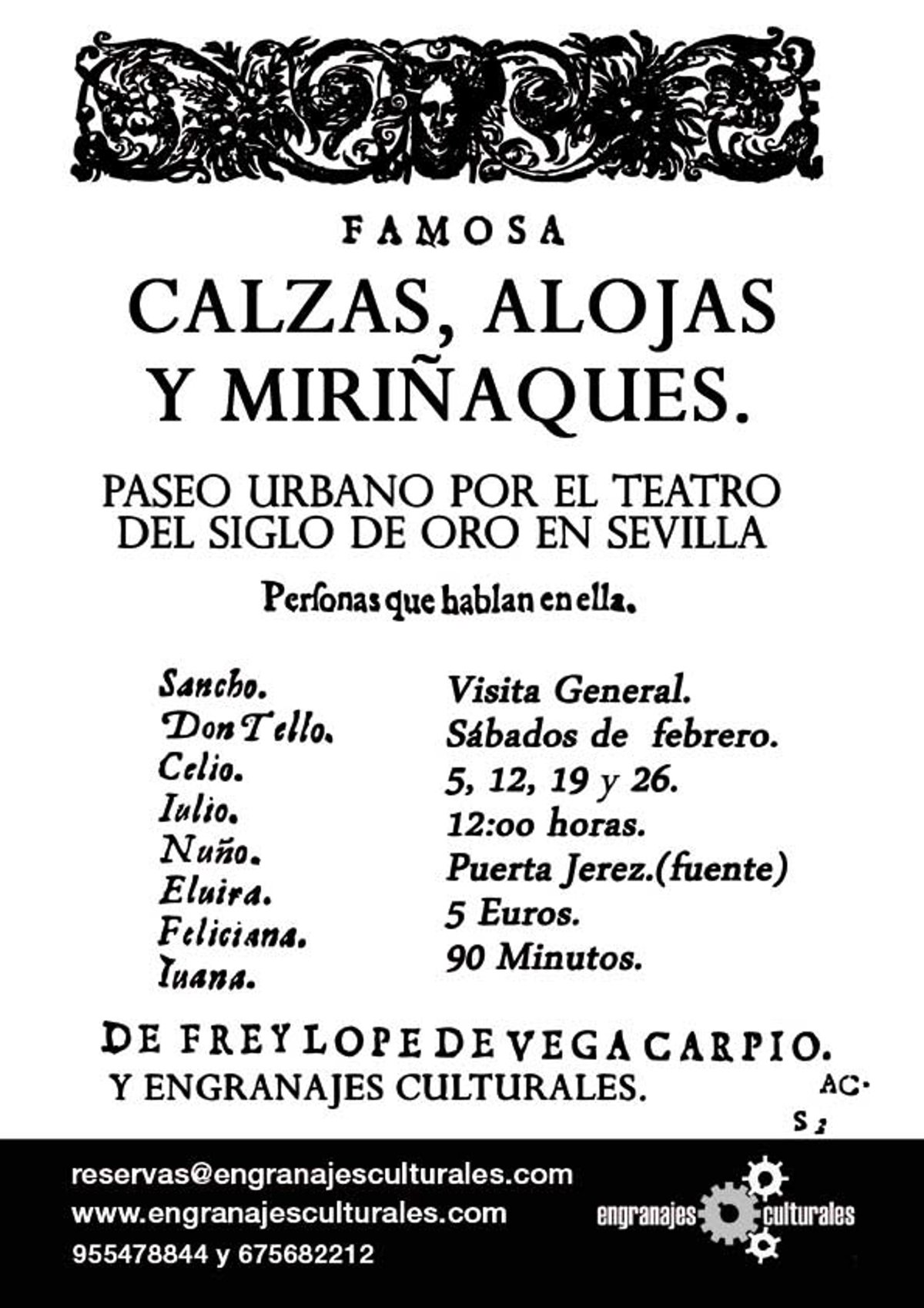 Desde este sábado 5 de febrero y durante todos los sábados del mes de febrero --12, 19 y 26-- los sevillanos podrán disfrutar de un paseo urbano por el teatro del Siglo de Oro en la capital, con un recorrido por las calles, las plazas y los corrales de comedias que fueron el escenario natural en donde con calzas, alojas y miriñaques una multitud de actores presentaron las grandes obras del teatro barroco.